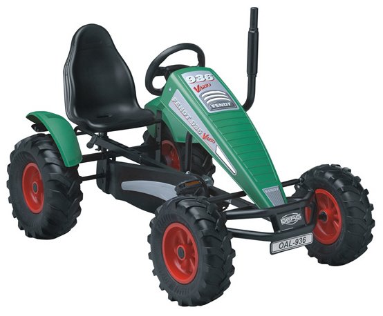 Серія веломобілів Berg TRAXX. Оснащений шинами з позашляховим протектором, передніми колесами діаметром 40 см і задніми колесами діаметром 46 см, вихлопною трубою.