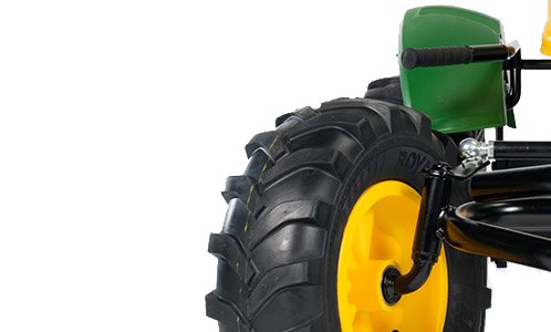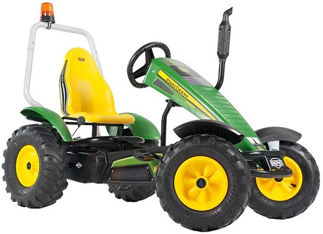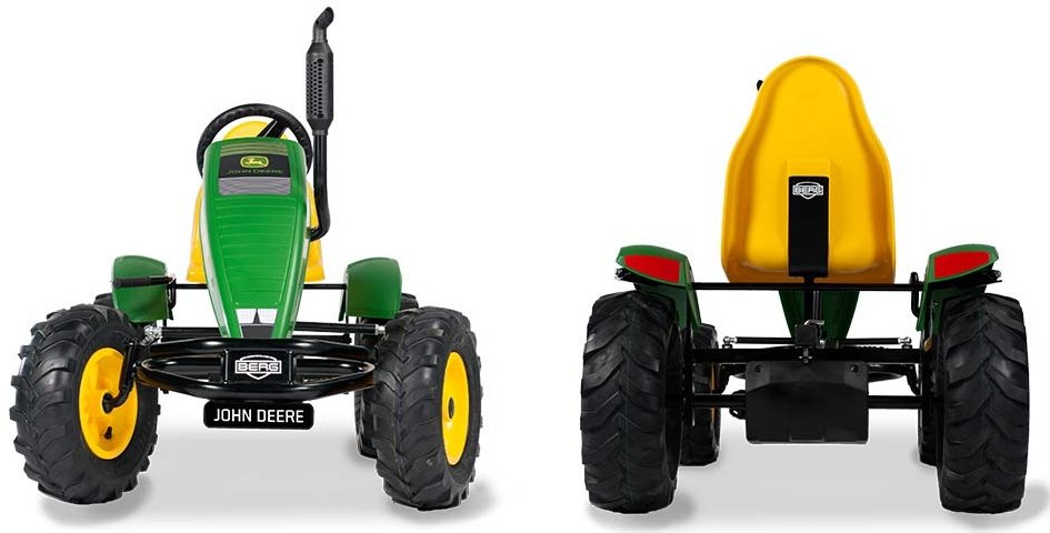 Веломобіль Berg John Deere BFR, характеристики: - вікова група 5+ ; - металева рама; - шини з позашляховим протектором ; - діаметр передніх коліс — 40 см, задніх — 46 см (!); - привід BFR (вільний хід при нерухомих педалях, задній хід, гальмування); - незалежна підвіска (стійкий на будь-якій поверхні); - подвійний шарнірний механізм керування (маневреність та легкість керування); - передній аеродинамічний спойлер ; - вихлопна труба;