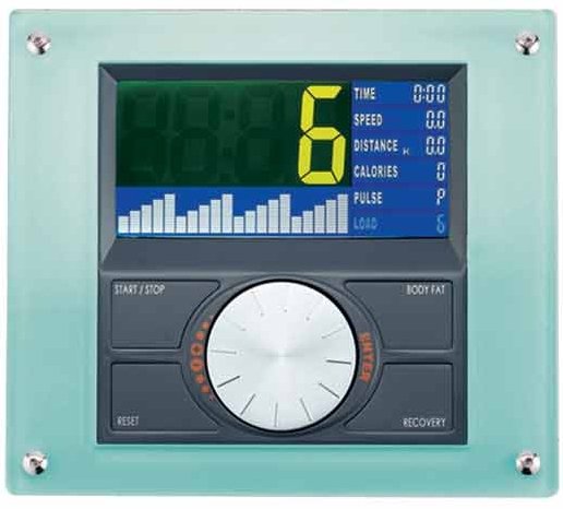 Компьютер велотренажера, функции: - время тренировки - пройденная дистанция - скорость - расход калорий - пульс - мощность - температура в помещении