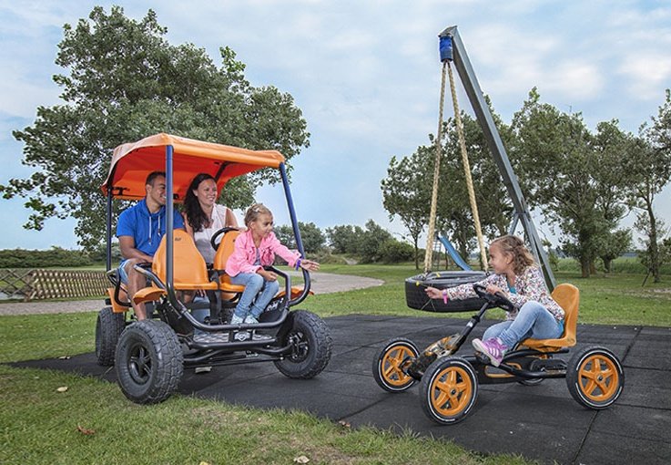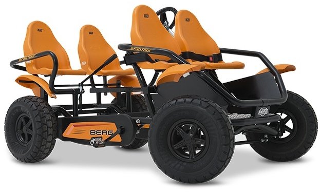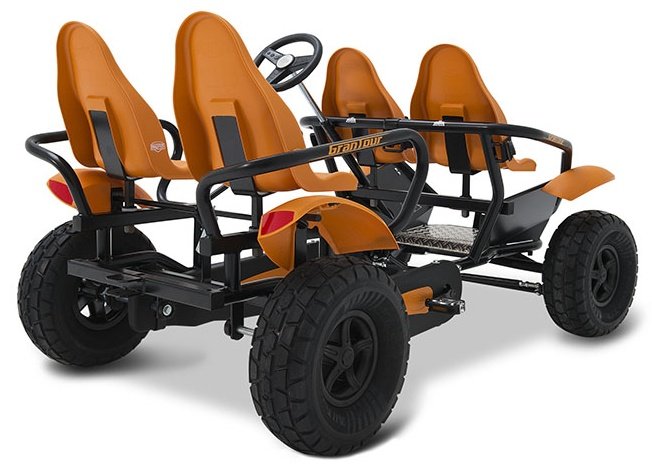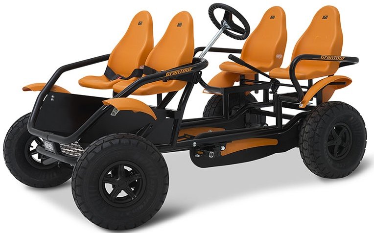 BERG GranTour Off Road 4 Seats — новий сімейний веломобіль, розрахований на двох дорослих та двох дітей. Комплектується колесами з покращеною прохідністю по бездоріжжю діаметром 46 см, приводом F і передніми сидіннями для дітей з ременями безпеки. Легко керується одним дорослим.