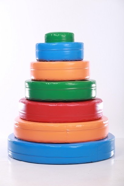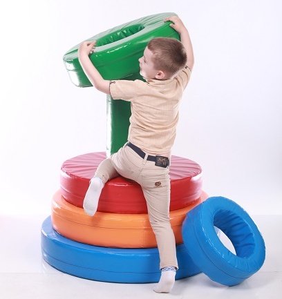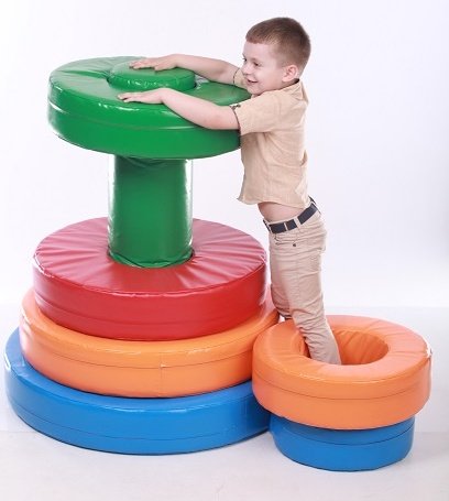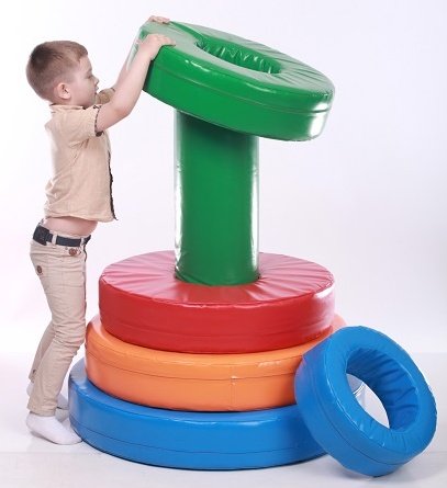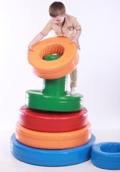 Состоит из 5 фигурных колец и 1 цилиндра разных цветов.